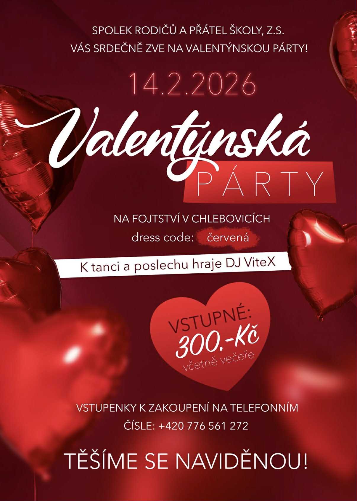 V sobotu 14.2.2026 od 19.00 hod. se přijďte pobavit na Valentýnskou párty, kterou na Fojtsví v Chlebovicích pořádá Spolek rodičů a přátel školy Chlebovice, z.s.